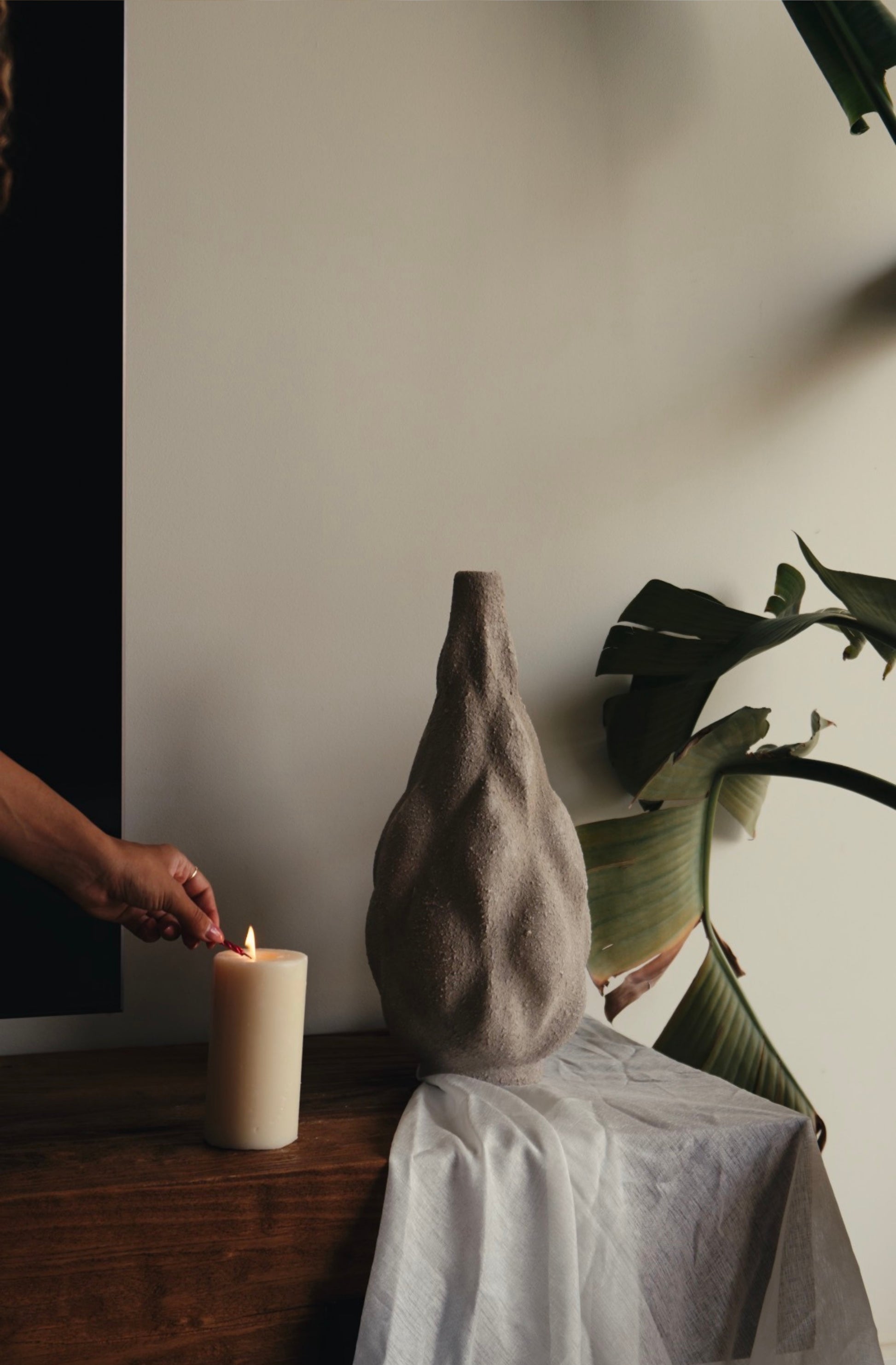 A celebration of texture and movement, the Fluid Form vase evokes the quiet rhythm of nature. Hand-sculpted in fiberglass and finished with a soft gray wash, its rippling silhouette mimics wind-carved stone and molten surfaces. Each vase is a unique study in contrast — raw and refined, bold and soft.