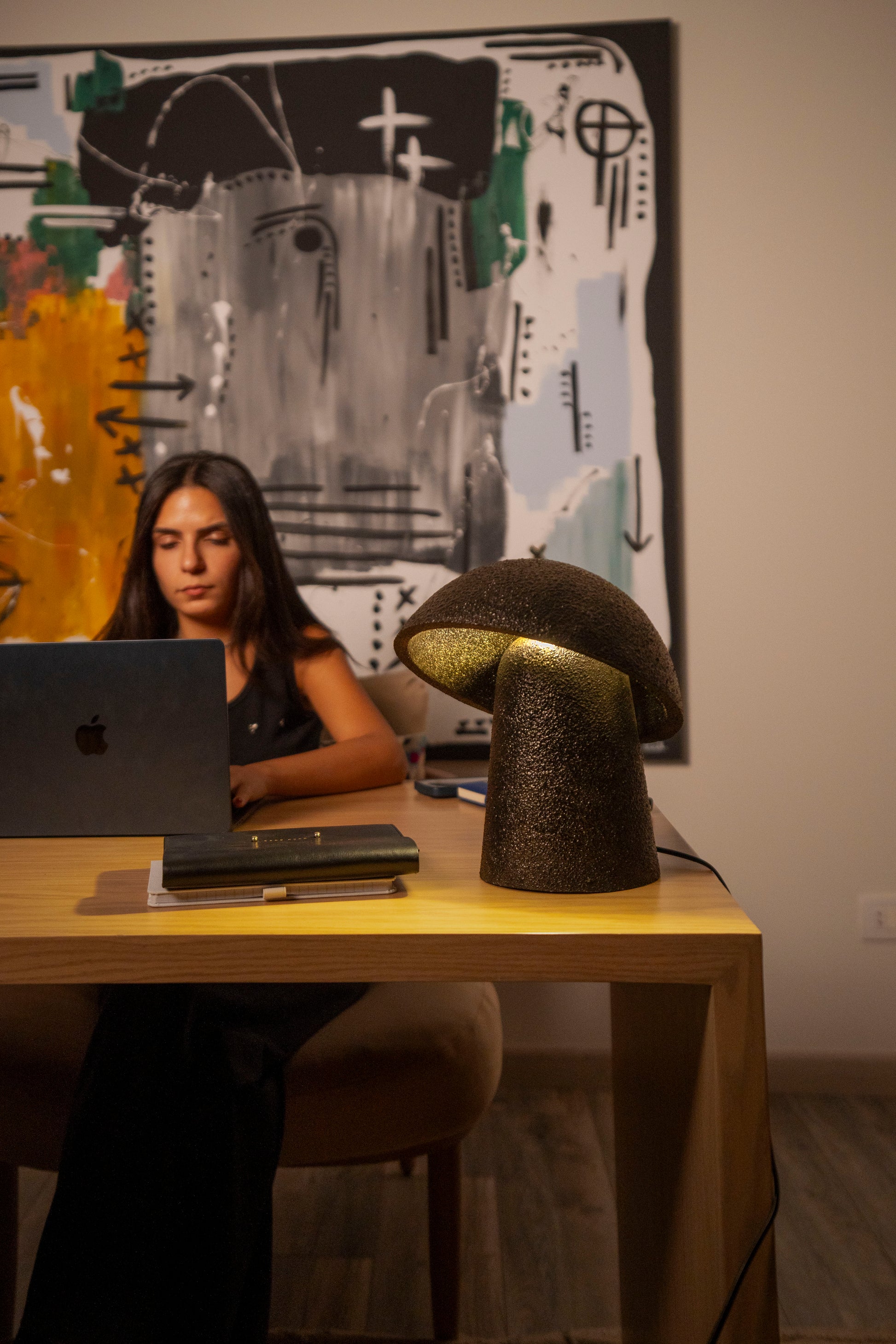 A statement in balance and contrast, the Halo Stem Lamp combines a solid, textured base with a softly curved dome that casts a warm, focused glow. Its interplay of matte surface and inner light creates quiet drama — a sculptural piece that feels both grounded and ethereal. Perfect for accent lighting or as a centerpiece that invites calm reflection.