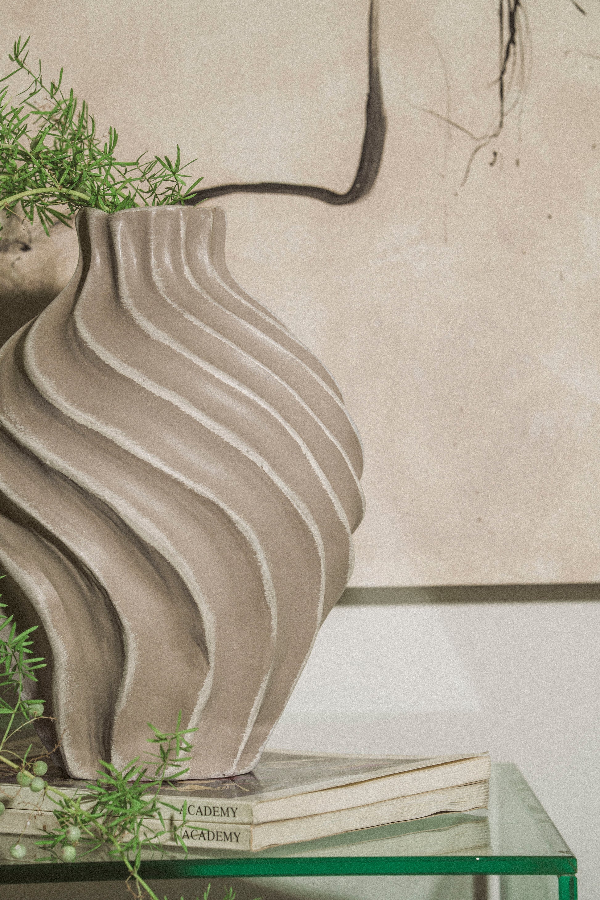 Defined by its flowing spiral grooves and wavy crest, Spira captures the rhythm of nature in solid form. Its tactile surface invites the eye to travel, while the neutral tone and grounded silhouette lend serenity to any setting. A statement piece that feels both ancient and modern—handcrafted to echo motion, softly frozen in time.