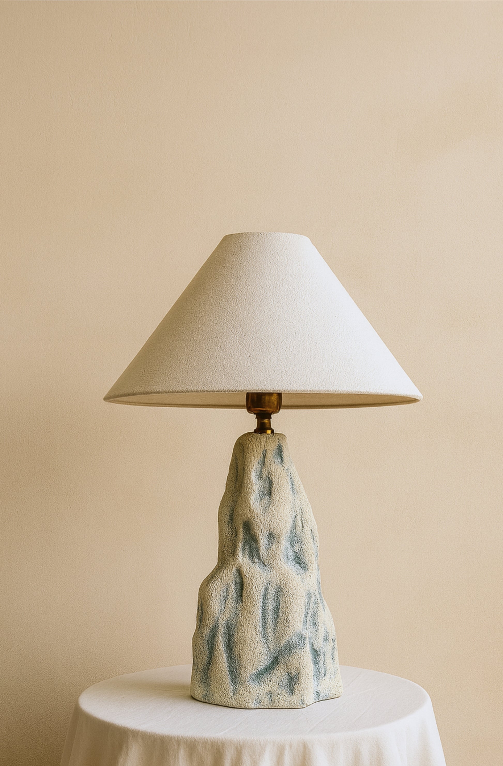 Evoking the rugged beauty of natural terrain, the Stone Haven lamp is handcrafted from lightweight fiberglass and finished in layered tones of moss green and off-white, mimicking the organic depth of a real stone. Paired with a wide, minimal linen chapeau, it casts a soft glow while serving as a grounded sculptural statement in any room.
