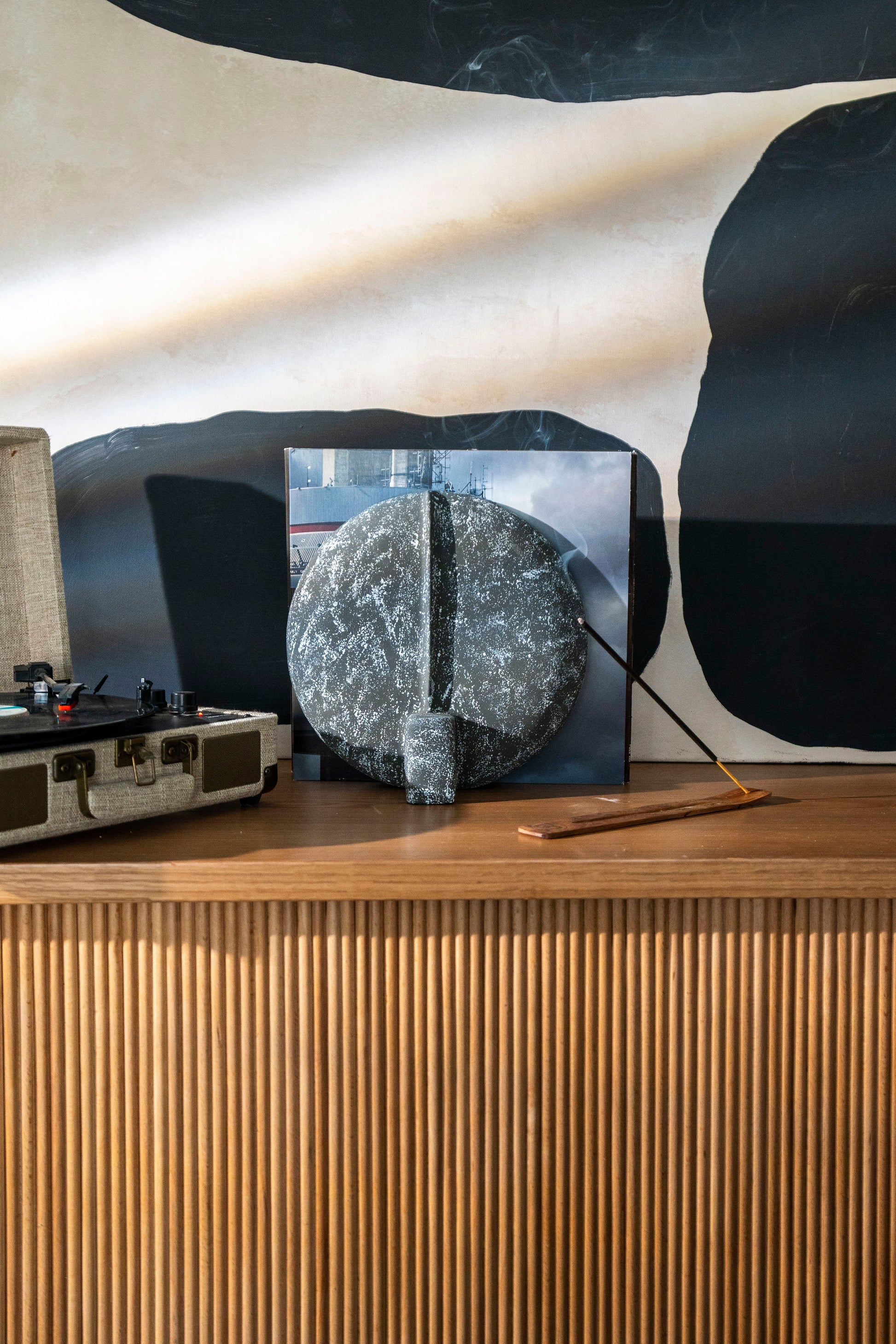 Defined by its circular silhouette and commanding central divide, Vault balances symmetry with tension. The pedestal base anchors its presence, while the soft matte finish softens its architectural lines. Both an object of stillness and strength, Vault invites contemplation—an ode to form as sanctuary.